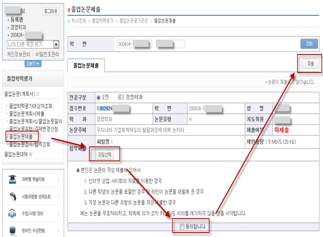 ? 학교 홈페이지 → 나의정보 → 학사정보 → 졸업학력평가 → 졸업논문(계획서) → 졸업논문제출(조회) [붙임1 참조]