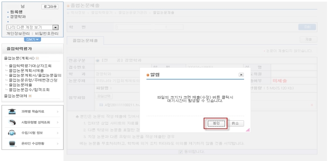 라. 졸업논문 제출 마감시간에 많은 학생들이 접속할 경우 학사정보시스템의 과부하로 인해 시스템 오류가 발생할 수 있으니 가급적 제출 마감시간을 피해 제출하기 바람.