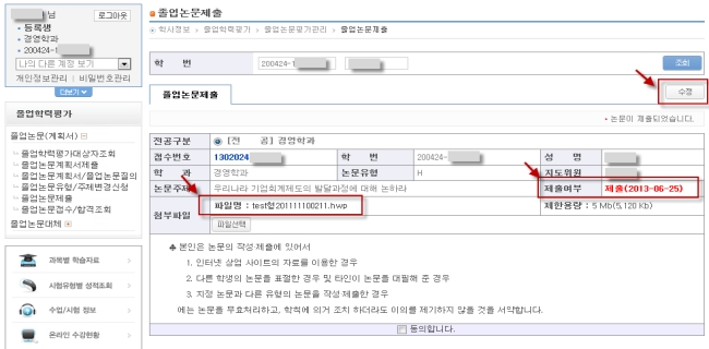 마. 논문 제출 후 지도교수가 논문심사 중 수정(보완) 사항이 있어 논문 재제출 지도(5.25.~6.20.)가 필요한 경우 대상자에게 E-mail로도 발송되지만 메일 수신이 안될 수도 있으니 반드시 홈페이지 학사정보 → 졸업학력평가 → 졸업논문(계획서) → 졸업논문(계획서)질의 또는 졸업논문(계획서)-복수에서 지도내용 여부를 수시로 확인하고, 또한 E-mail 주소는「개인정보수정」을 통하여 확인하여 수정 바람.