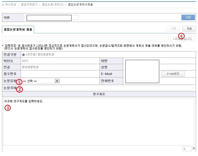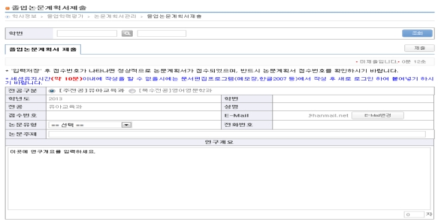 ? 홈페이지 → 맞춤정보 → 학사정보 → 졸업학력평가 → 졸업논문(계획서) → 논문 계획서 제출 후 접수번호와 ??논문계획서가 제출 되었습니다??메시지 확인