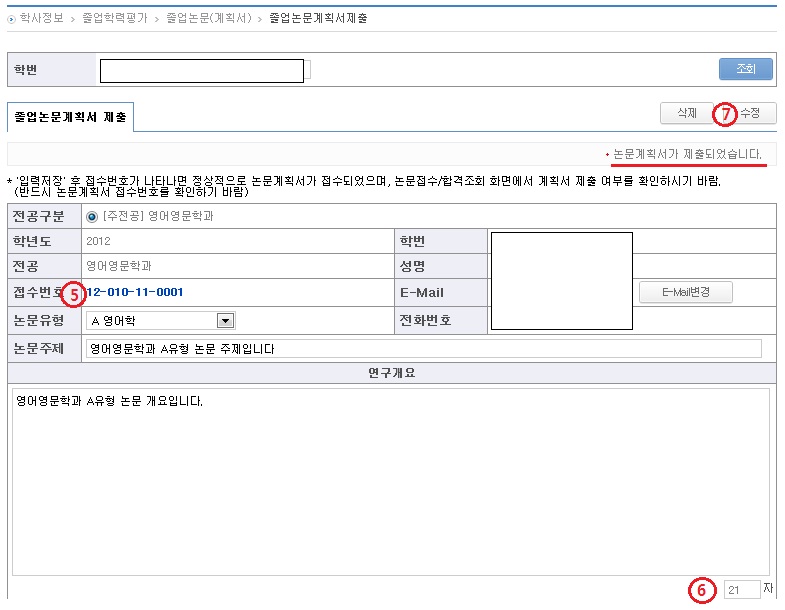? 상단의 “논문계획서가 제출되었습니다.” 메시지와 접수번호가 제대로 이루어졌는지 학생이 직접 재 로그인하여 확인할 것