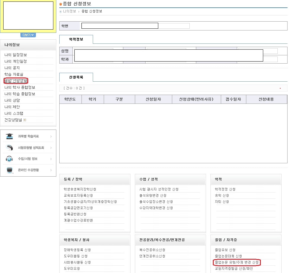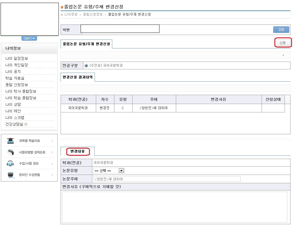 ? 홈페이지(맞춤정보) → 학사정보 → 졸업학력평가 → 졸업논문(계획서) → 졸업논문유형/주제변경신청 또는 로그인 → 맞춤정보 → 종합신청정보 → 졸업자격증 → 졸업논문유형/주제변경신청 클릭