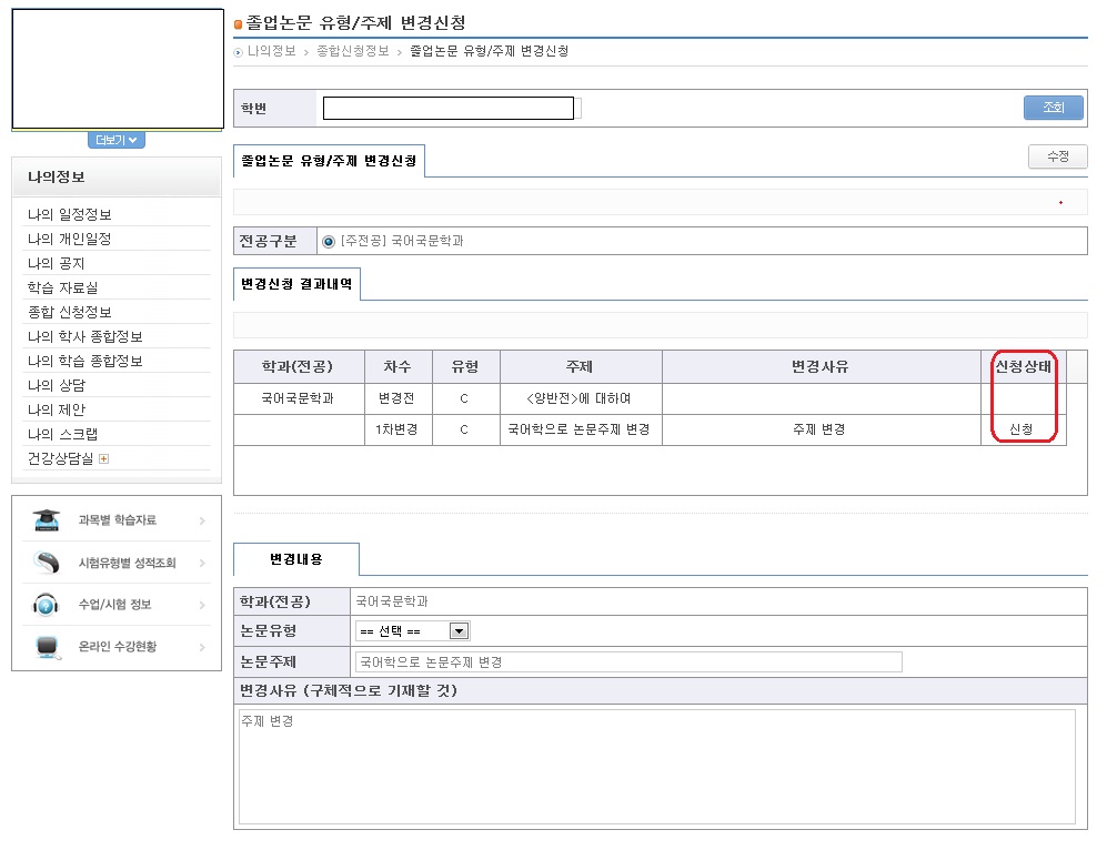 ? [서식3] 졸업논문계획서 제출 후 화면